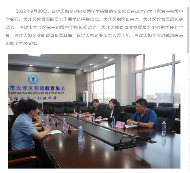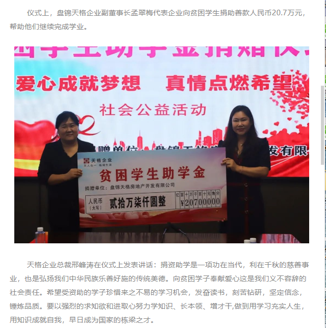 爱心助学 筑梦未来丨盘锦天格企业向贫困学生捐资助学