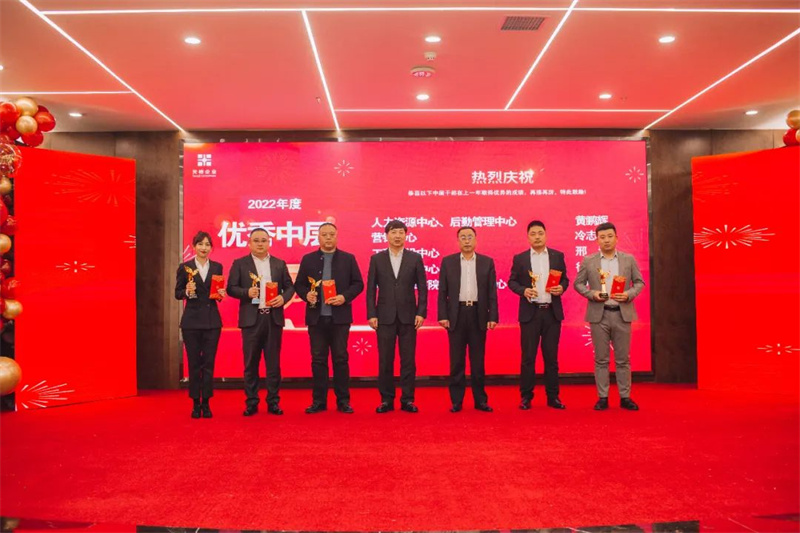 (企业负责人孟凡旭、总裁邢峰涛为优秀中层干部颁奖)